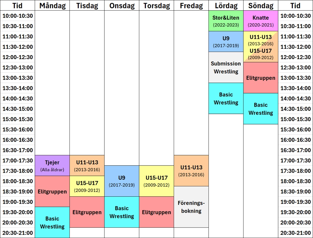 Ordinarie schema, kan variera från vecka vill vecka. Se kalender för aktuella tider.